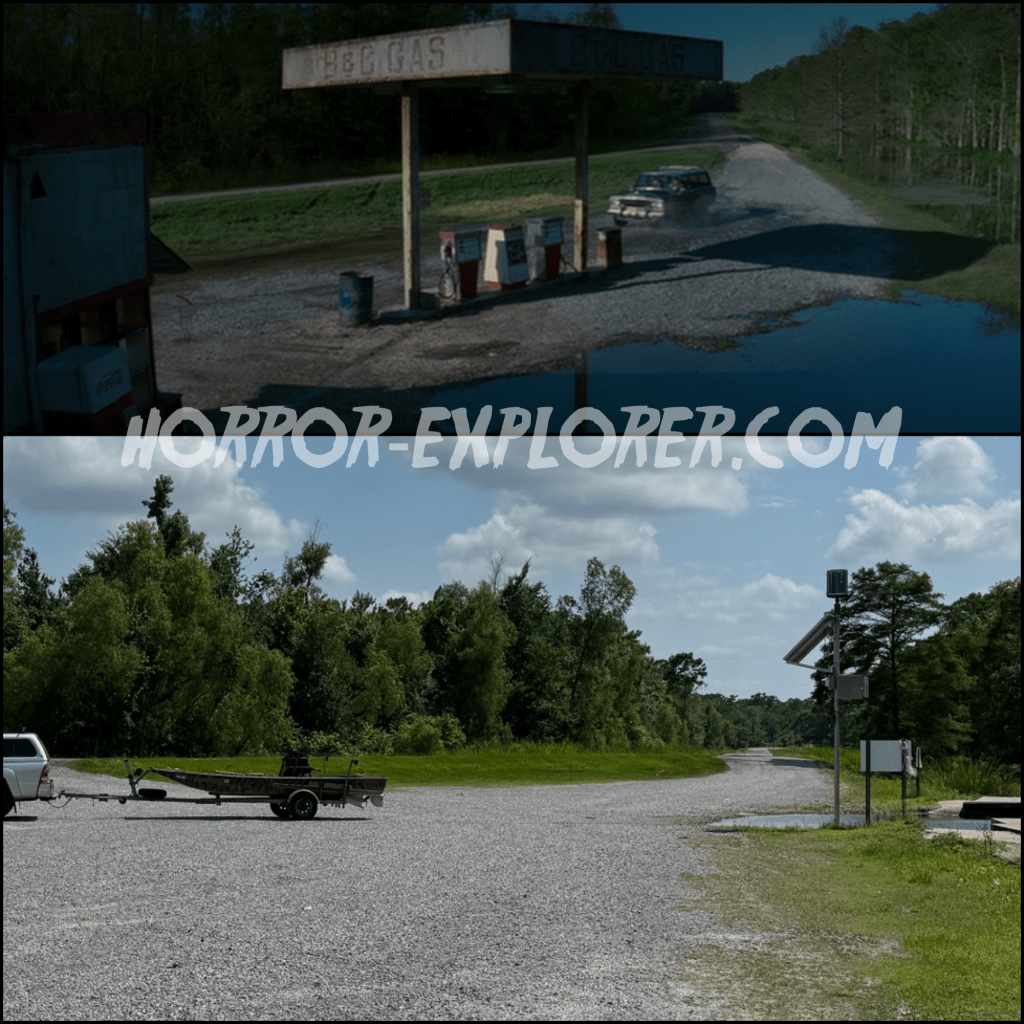 The gas station was a set that was constructed at Sanchez Boat Landing and removed after filming was completed.